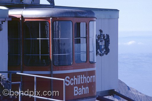 Cable car of the Schilthornbahn at Piz Gloria on top of the Schilthorn mountain in the Bernese Oberland Alps region of Switzerland. Location for the James Bond 007 film On Her Majesty's Secret Service. Blofelds coat of arms is on the side of the station building.
