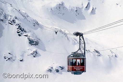 Cable car descending from Piz Gloria towards Birg station in the Bernese Oberland Alps region of Switzerland. Location for the James Bond 007 film On Her Majesty's Secret Service.
