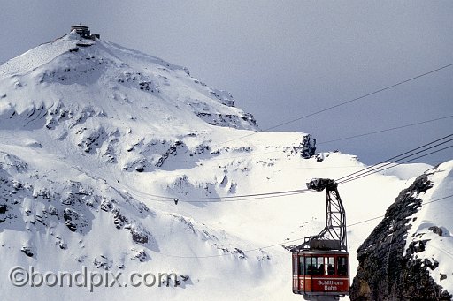Cable car ascends towards Piz Gloria from Birg station in the Bernese Oberland Alps region of Switzerland. Location for the James Bond 007 film On Her Majesty's Secret Service.