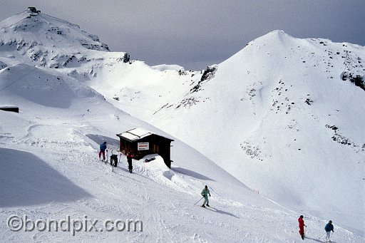 Skiers on the slopes beneath Piz Gloria near Birg station in the Bernese Oberland Alps region of Switzerland. Location for the James Bond 007 film On Her Majesty's Secret Service.