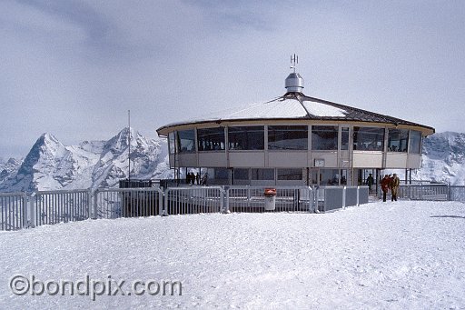 Piz Gloria on top of the Schilthorn mountain in the Bernese Oberland Alps region of Switzerland. Location for the James Bond 007 film On Her Majesty's Secret Service. The Eiger and Monch mountains are in the background.