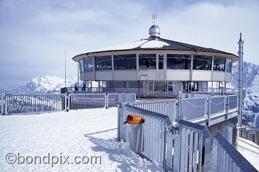 Piz Gloria on top of the Schilthorn mountain in the Bernese Oberland Alps region of Switzerland. Location for the James Bond 007 film On Her Majesty's Secret Service. The Wetterhorn mountain is in the background.