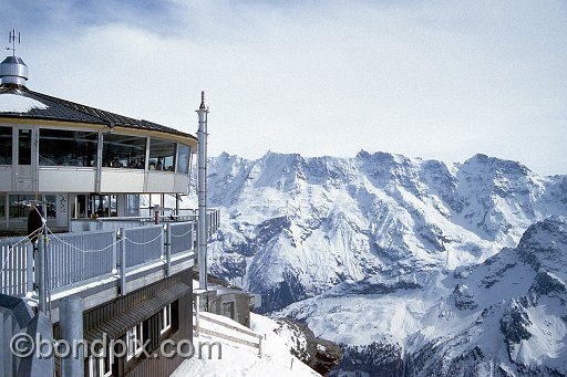 Piz Gloria on top of the Schilthorn mountain in the Bernese Oberland region of Switzerland. Location for the James Bond 007 film On Her Majesty's Secret Service. The Swiss Alps are in the background.