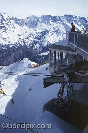 Schilthornbahn cable car at Piz Gloria station on top of the Schilthorn mountain in the Bernese Oberland region of Switzerland. Location for the James Bond 007 film On Her Majesty's Secret Service. The Swiss Alps are in the background.